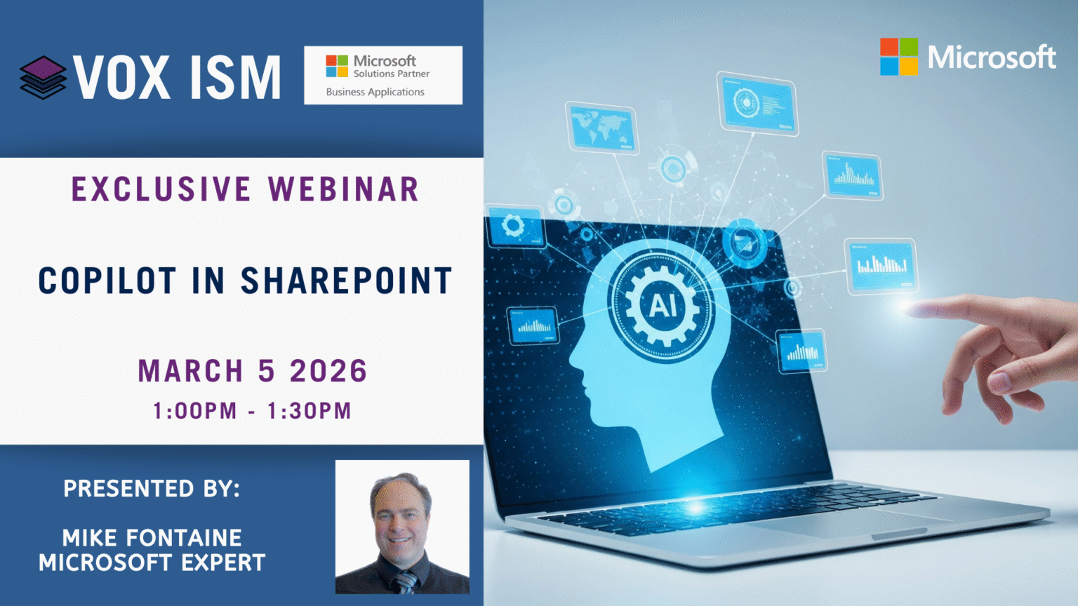 Join Microsoft & VOX ISM for an insightful webinar exploring how Copilot transforms the SharePoint experience for Canadian organizations. Learn how this AI-powered assistant can help your teams streamline document management, enhance collaboration, and automate daily workflows—delivering tangible productivity gains while ensuring robust data security and compliance. Whether you’re an IT leader, content manager, or business user, discover how Copilot in SharePoint can empower your modern workplace and drive digital transformation.